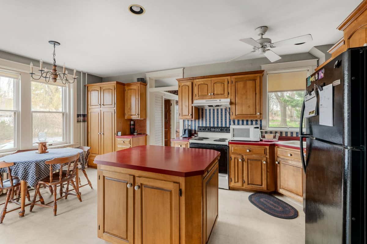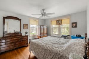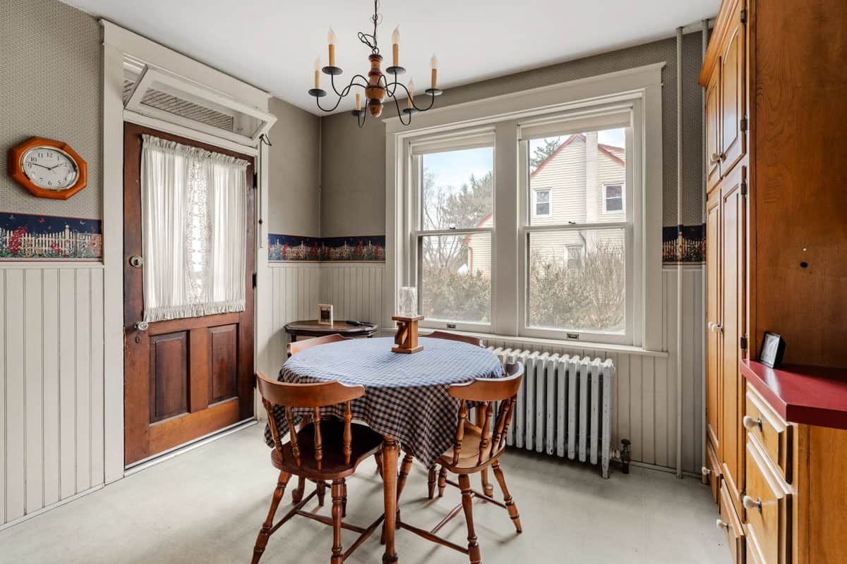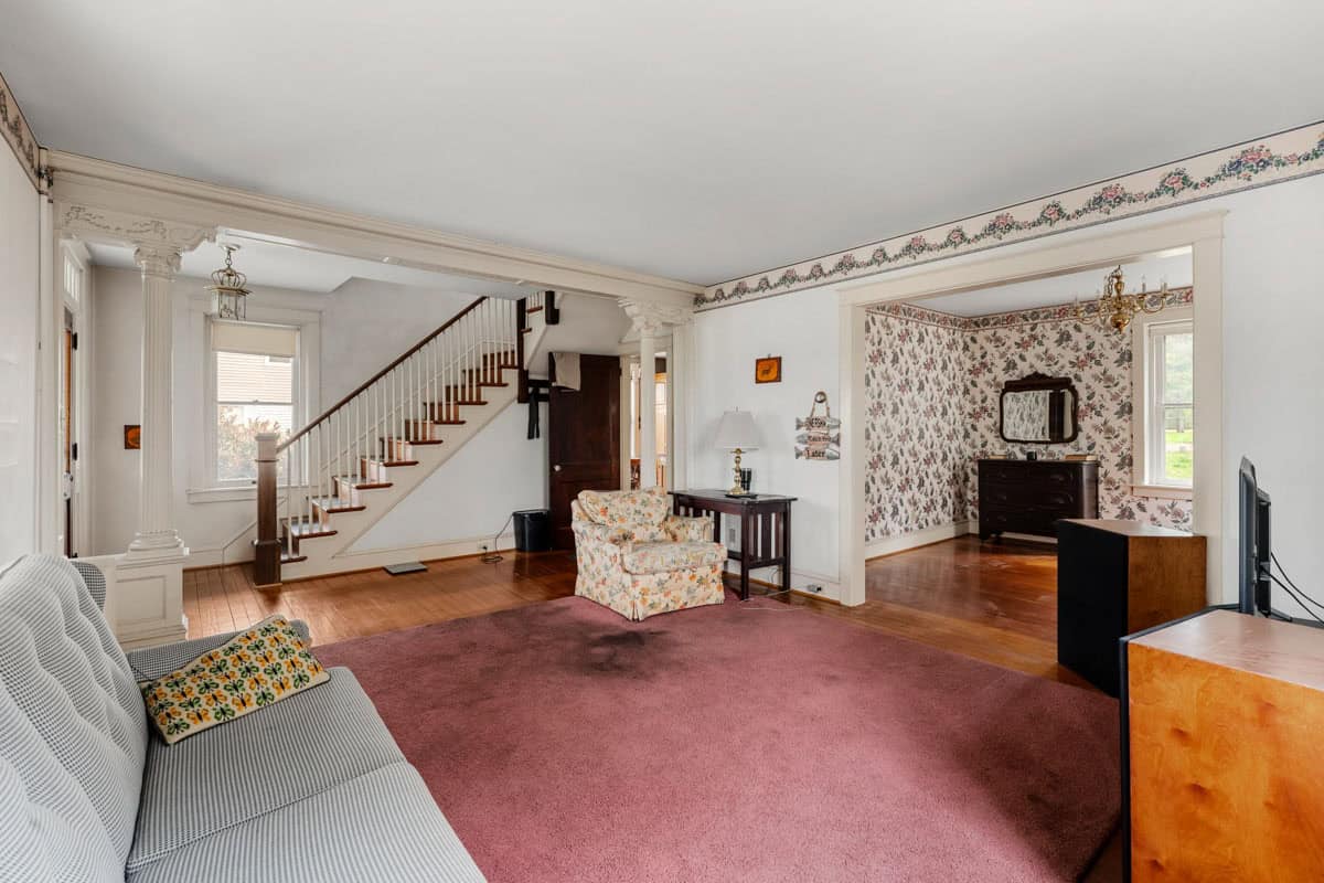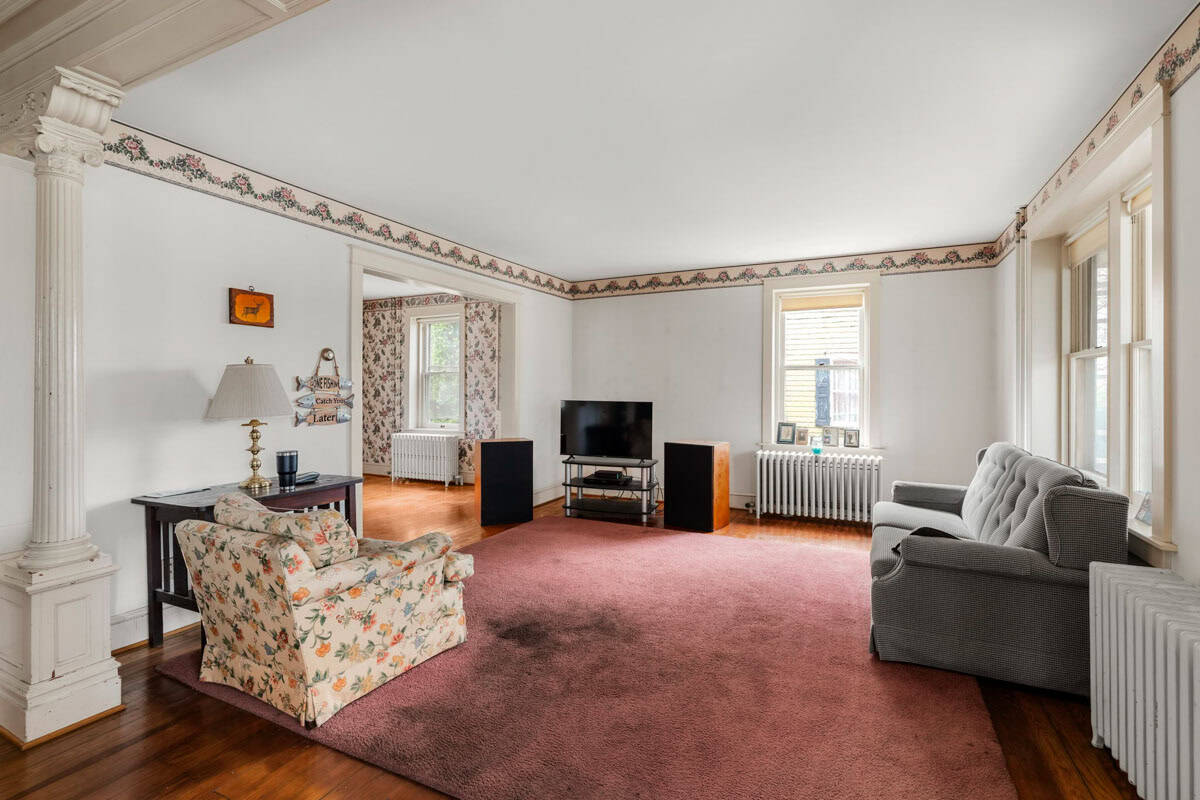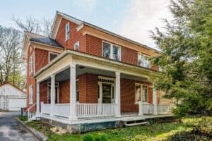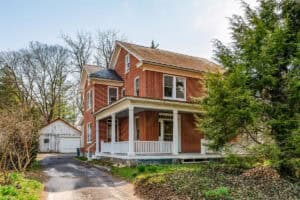 - hDESCRIPTION: This substantial character-filled residence offers scale, charm and exciting future potential. With its commanding brick facade, classic wraparound porch and generous grounds framed by mature trees, the home makes an immediate impression. Inside, timeless character is on display through hardwood floors, high ceilings, large windows, original woodwork and a series of spacious rooms that allow flexibility for family living, entertaining, working from home or future reconfiguration. Formal and informal living areas add to the sense of space, while the kitchen provides a functional layout with ample cabinetry, an island and adjoining dining space ready for everyday living and gatherings alike. The home also features 4 well-proportioned bedrooms, multiple utility spaces and 1.5 bathrooms, offering a strong foundation for whatever comes next. Downstairs, the basement adds extensive storage and workshop space, while outside, the sizeable yard, established trees, open lawn areas and detached garage/outbuilding further enhance the property’s practicality and appeal. This is a home with genuine presence and personality, offering classic architecture, strong bones and room to enhance. Opportunities of this scale and character are increasingly hard to find, making this a compelling chance to secure a property with lasting appeal and enormous potential.