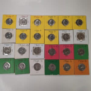 The catalog includes gold coins, half cents, large cents, Indian Head and Wheat pennies, and early two- and three-cent pieces. Collectors will find extensive groups of Flying Eagle cents, Buffalo nickels, Liberty nickels, and Jefferson nickels. Numerous uncirculated and circulated coins are offered, including both individual key dates and complete books. Silver coins include Barber, Mercury, and Roosevelt dimes, Seated and Standing Liberty quarters, Washington quarters, and a large number of silver half dollars including Liberty Walking, Franklin, and Kennedy types. Dozens of Morgan and Peace silver dollars are included, with several GSA Carson City issues, and many housed in vintage coin folders.