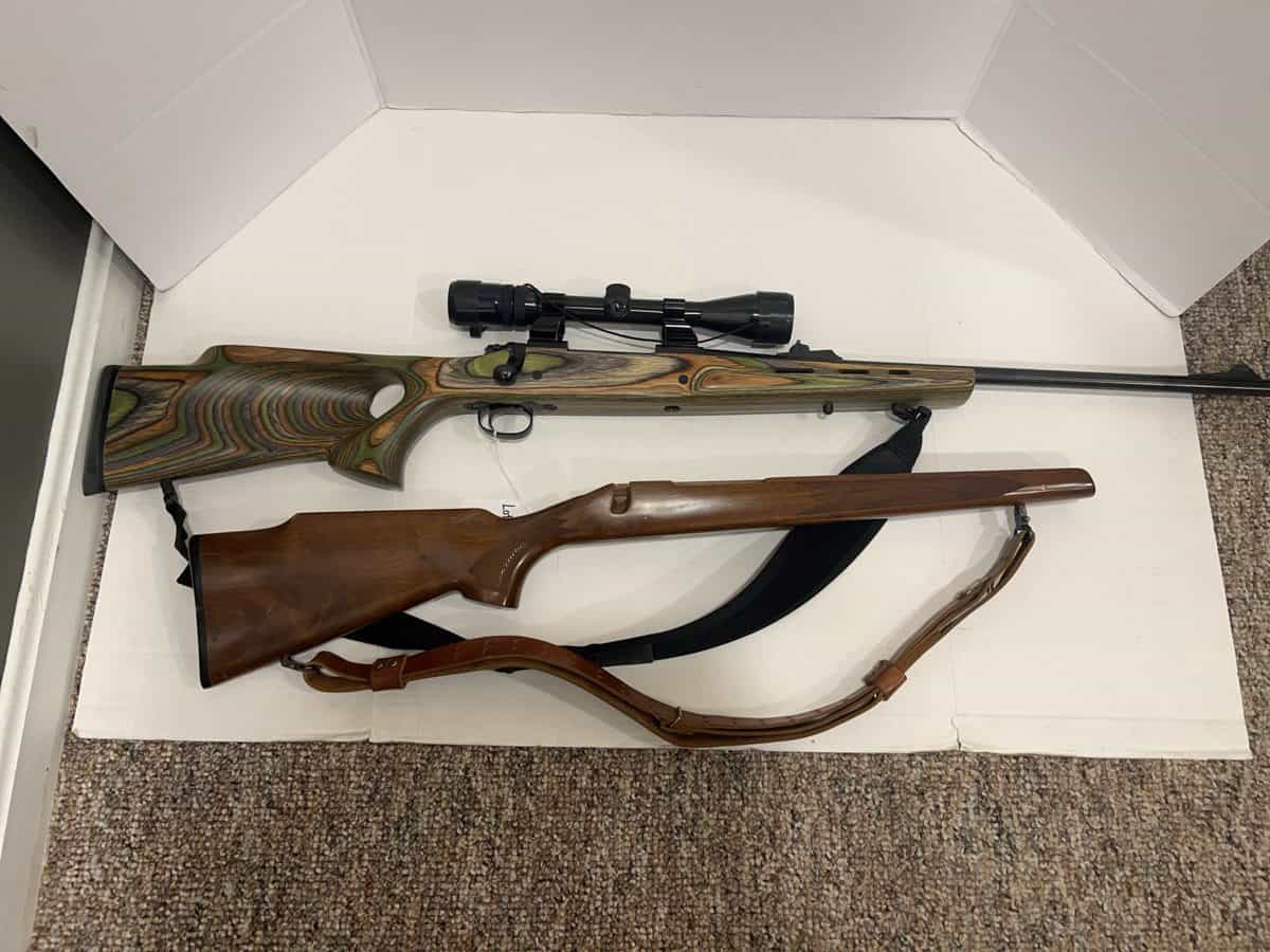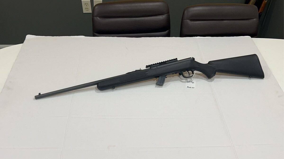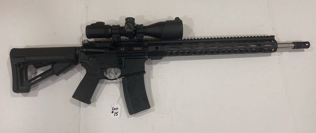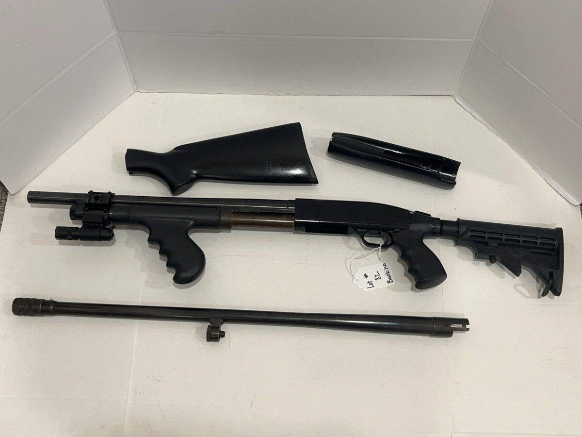Long guns include Remington, Savage, Mossberg, Marlin and Bushmaster rifles, AR style firearms, .22 caliber rifles, 12 gauge and 20 gauge shotguns, and a custom AR 15 platform firearm. An antique early American flintlock long rifle is also included, along with a variety of hunting and sporting configurations. Many firearms are accompanied by factory packaging or noted modifications such as upgraded stocks or rails.