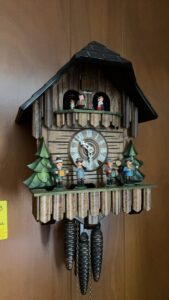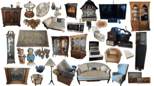 Furnishings include multiple cabinets and bookcases, curio and display cabinets, accent tables, coffee and cocktail tables, sofas and chairs, dining tables with chairs, beds and bedroom furniture, rugs, lamps, mirrors, and specialty items such as a grandfather clock, cuckoo clock, and decorative fireplace pieces. There are also themed collections including miniatures, dolls, teddy bears, and other display décor.
